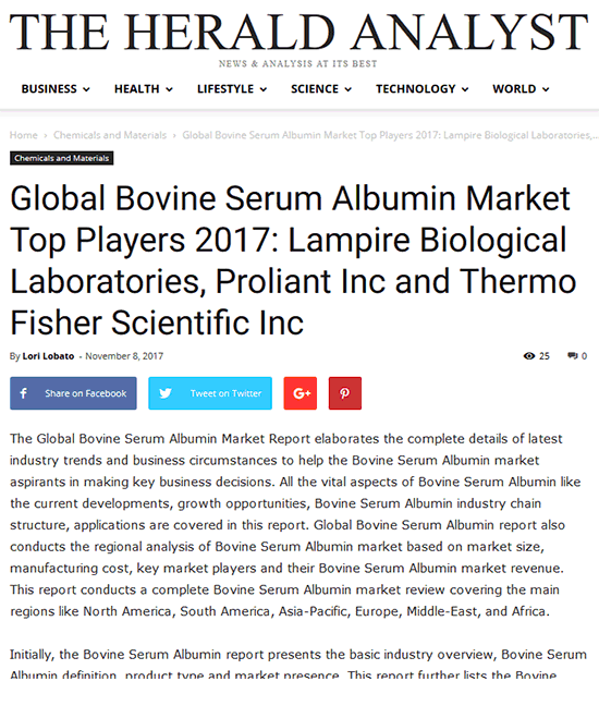 Global Bovine Serum Albumin Market Top Players 2017: Lampire Biological Laboratories...