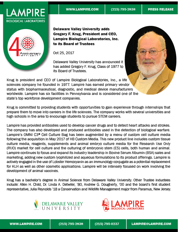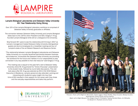 The connection between Delaware Valley University and Lampire Biological dates back to the 1970's when President and CEO, Gregory F. Krug, founded Lampire Biological while still an undergrad at the University.
