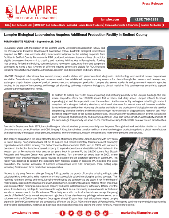 Lampire Biological Laboratories Acquires Additional Production Facility in Bedford County