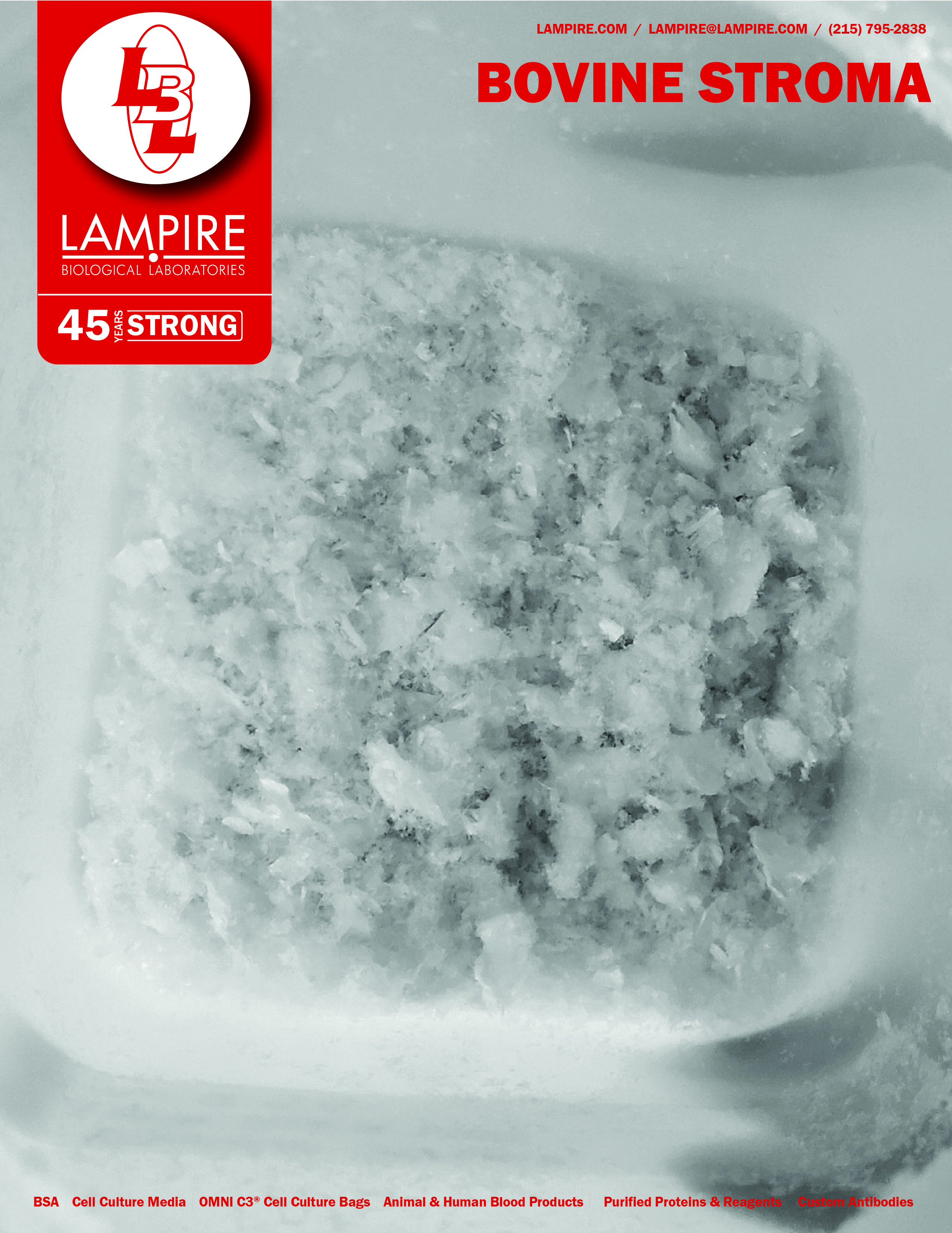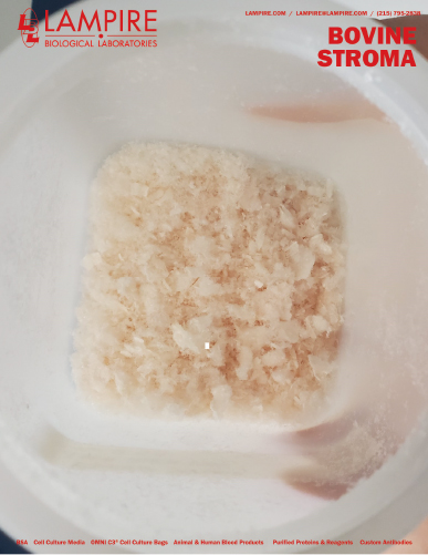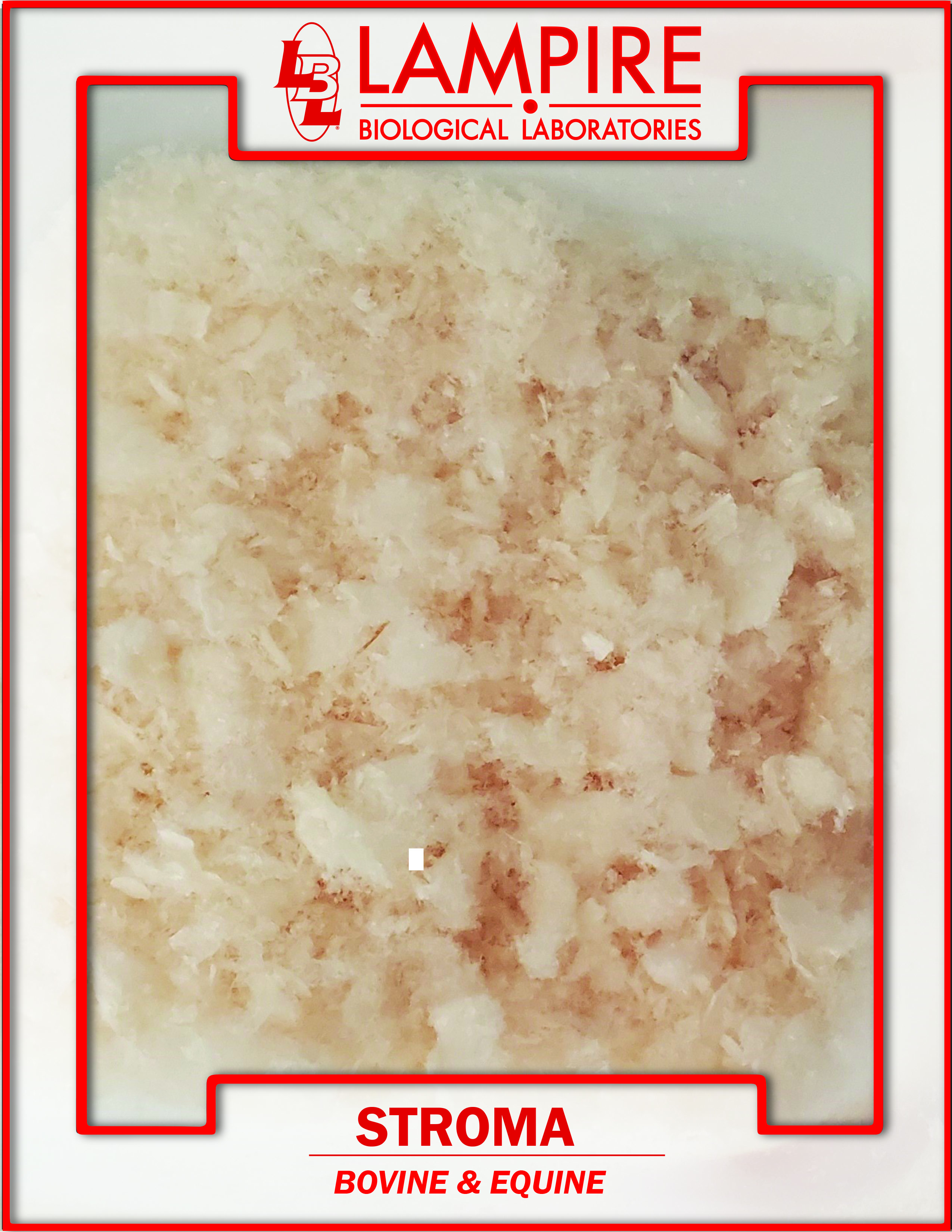 LAMPIRE offers Bovine and Equine Stroma. To manufacture Stroma, whole blood is aseptically drawn from normal, healthy animals. The red blood cells are washed with saline and lysed with a hypotonic potassium phosphate solution. The solution is clarified via centrifugation, and the resulting pellet is washed to isolate the stroma. The hemoglobin is removed through repeated washes, until the wash solution is clear and the Stroma (cell debris) is a light pink color. Stroma is sold as a lyophilized powder, but can also be prepared as a frozen liquid upon request. This product is not intended for use in transfusion or surgical applications....Read more